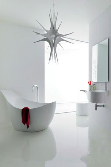 这间偌大的独立浴室,整个空间都是以明亮色调的白色打底,但丝毫没有让人感觉到单调,其中绿植的点缀起到了很大的作用。因为白色的简单,配搭起室内的装饰,相得益彰。中间两款流线造型的独立浴缸,适合你和伴侣在这里泡上一个美美的泡澡,在绿意盎然的环境中,享受无尽春色,有着时光静止的写意。